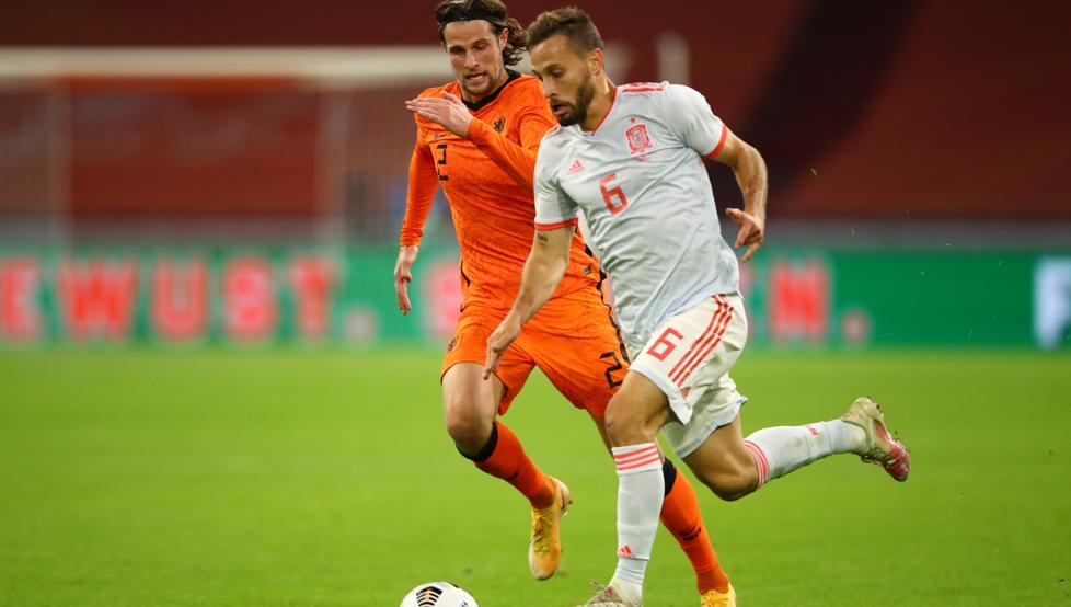 Canales, autor del gol español, conduce el balón ante la marca de Hateboer. España y Países Bajos igualaron 1 a 1. Foto @mundodeportivo