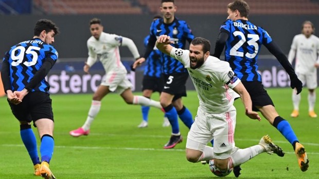 Nicoló Barella le comete penalti a Nacho, Hazard lo cambió por gol. Triunfo clave del Real Madrid ante Inter para encarrilar la clasificación. Foto abc.es