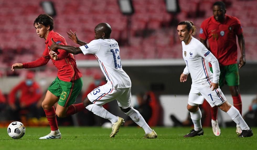 Kanté, el autor del gol, presiona a João Félix, ante la atenta mirada de Griezmann. Francia venció a Portugal en Lisboa. Foto @elcomercio