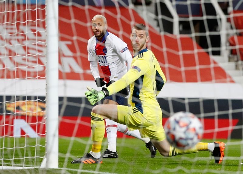 Neymar define ante la salida de De Gea. Psg logró una resonante victoria en Old Trafford y encamina su pase a octavos. Foto Marca.com