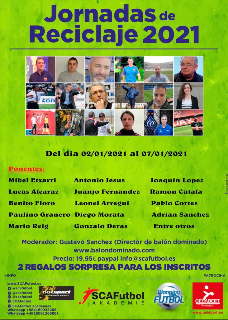 El año 2021 arranca con un gran evento. Una bonita chance para hablar de fútbol con gente muy prestigiosa. Mario Reig, director de SCA Fútbol Academias será uno de los ponentes junto a Lucas Alcaraz, ex entrenador de Levante y Almería, Benito Floro, ex entrenador de Real Madrid, entre otros.