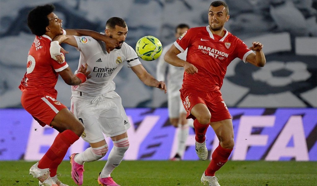 Benzema lucha ante la marca de Koundé y Jordan. Real Madrid rescató un empate sobre el final y aún lucha por La Liga. Foto Elcomercio.pe