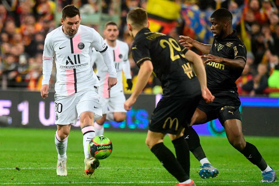 Messi rodeado de 2 jugadores del Lens. El argentino gravitó poco en el empate 1 a 1. Foto elcomercio.pe