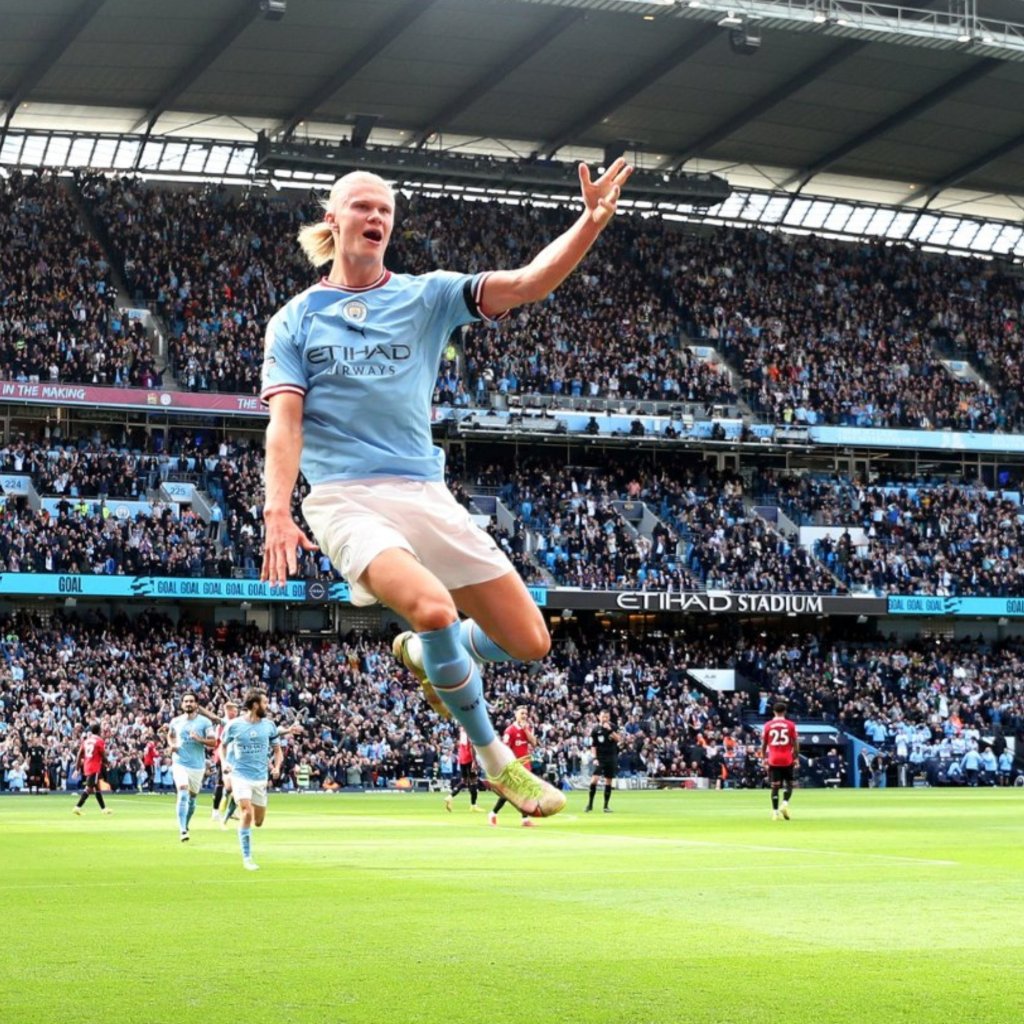 Erling Haaland festeja uno de sus goles. Manchester City goleó 6 a 3 su clásico rival. Foto Twitter.com