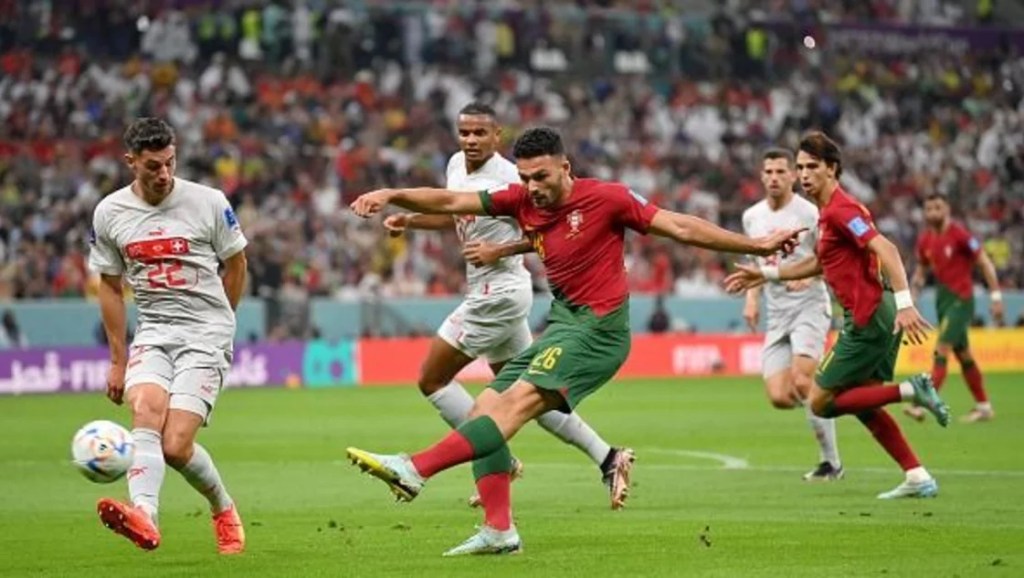 Gonçalo Ramos, la figura estelar de la noche, convierte el primer tanto. Portugal goleó a Suiza y clasificó a cuartos de final. Foto as.com