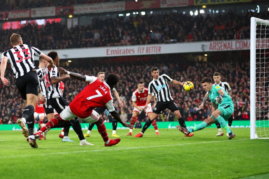 Bukayo Saka remata pero su tiro es contenido por el portero Pope. Arsenal y Newcastle igualaron 0-0. Foto twitter.com