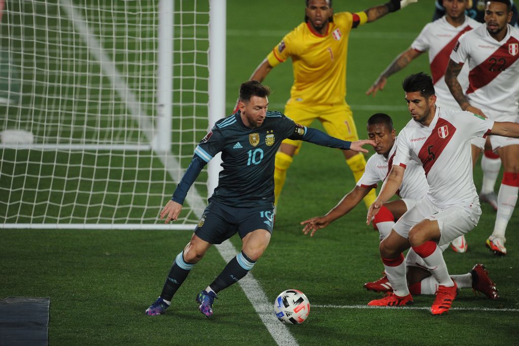 Messi controla el balón, ante la mirada de muchos defensores peruanos. Argentina ganó y es casi un hecho su pasaje al próximo mundial. Foto lavozdelinterior.com